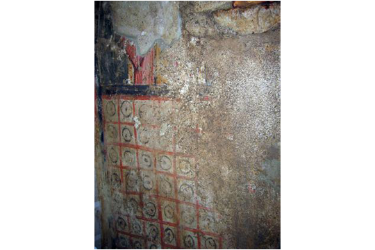 Il vano è ricoperto di intonaco bianco, su cui furono dipinti due cicli di affreschi. Nella parte alta delle pareti sono delle scene figurative, e delle decorazioni a motivi geometrici. Costanti in tutto il ciclo sono la vivacità e la potenza espressiva della rappresentazione e dei suoi colori.