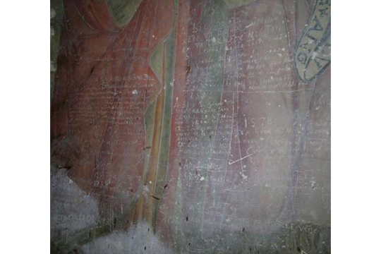 L’edificio, che all’esterno si presenta in forma assai modesta, all’interno, invece, ci offre una dovizia di affreschi e di memorie graffite e a pennello che raccontano oltre un secolo di vita arsolana.