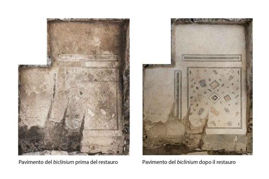 Il rivestimento pavimentale del vano corridoio è realizzato con un conglomerato a base di malta mescolata con composti fittili e inserti di marmo (cementizio a base fittile), fortemente compattato e accuratamente livellato. Il piano di calpestio è costellato di scaglie bianche di palombino, inserti di calcare nero, giallo-ocra e verde, sparsi irregolarmente nel campo ad impreziosire la superficie che presenta una rubricatura rossa, nella parte più regolare e ampia del vano, e nera nella parte in cui il vano si apre a meridione, divenendo un corridoio.